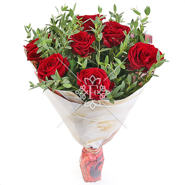 «Время любить» - букет из красных роз, которые выглядят весьма утонченно и элегантно в обрамлении нежной зелени.